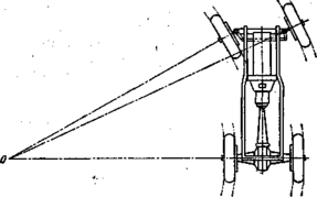 Для того чтобы при движении автомобиля на повороте колеса его имели качение без бокового скольжения, они должны катиться по окружностям, описанным из одного центра, который называется центром поворота. В этом центре О (рис. 1) должны пересекаться продолжения осей всех колес. Для соблюдения данного условия внутреннее к центру поворота управляемое колесо должно поворачиваться круче, т. е. на больший угол, чем наружное колесо. Для одновременного поворота колес на необходимые различные углы служит рулевая трапеция.