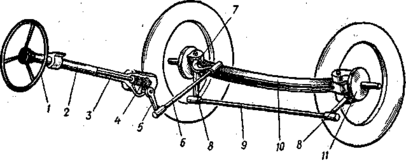 При повороте рулевого колеса / в ту или другую сторону вместе с ним вращается вал 3, приводя в действие рулевой механизм 4, поворачивающий сошку 5. Нижний конец сошки перемещается вперед или назад, поворачивая через тягу 6 рулевой рычаг 7 с поворотным кулаком, соединенным шарнирно с осью 10. Через рулевые рычаги 8 и поперечную тягу 9 на соответствующий угол поворачивается и другой кулак 11 с установленным на его цапфе колесом.