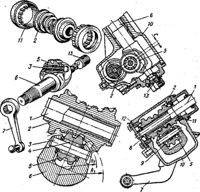 Червяк 2 закреплен на рулевом валу 1 и установлен на подшипниках 11 в картере 10 рулевого механизма. Ролик n5 установлен на шариковом 9 или игольчатом 4 подшипнике на оси 3, закрепленной в головке вала 6. Бал лежит на подшипниках в приливе картера. На наружном конце вала закреплена сошка 7.