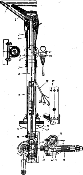 В рулевом управлении данного типа предусмотрена установка противоугонного устройства, закрепляемого на рулевой колонке и совмещающего замок зажигания 21 и специальный механизм со штифтом 20, входящим в паз на втулке 6, закрепленной на рулевом валу. При выключении зажигания штифт входит в паз втулки и запирает руль. Пучок проводов 22 от выключателя сигнала и противоугонного устройства выведен из колонки наружу.