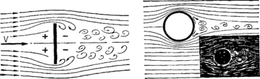 Плоская пластинка (Рис. 1.9), помещенная в поток под углом 90°, создает довольно резкое изменение направления движения потока, обтекающего ее: торможение потока перед ней, поджатие струек у ее краев и образование непосредственно за краем пластинки разрежения и больших вихрей, которые заполняют всю область за пластинкой. Перед пластинкой, где в результате торможения частичек воздуха и падения их скорости до нуля (кинетической энергии воздушного потока полностью переходит в потенциальную), давление (по уравнению Бернулли) будет больше чем в невозмущенном потоке, а за пластинкой вследствие разрежения давление уменьшится.