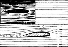 Здесь имеет место так называемое несимметричное обтекание. Наибольшая деформация струек наблюдается там, где тело имеет наибольшую величину искривления поверхности (точка К). В районе этой точки струйки поджимаются, поперечное сечение их уменьшается. На нижней, менее искривленной поверхности деформация потока будет меньше.