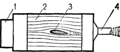 1 - источник дыма; 2 - струйки дыма; 3 - обтекаемое тело; 4 - вентилятор