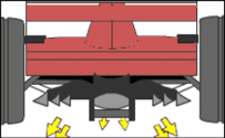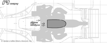 На самом деле принцип действия диффузора прямопротивоположен принципу действия антикрыла: вместо того, чтобы отталкивать воздух, диффузор засасывает его. Эффект этот получается из-за аэродинамической формы. Диффузор находится в самой нижней, "хвостовой" части болида, прямо под задним антикрылом, и объем диффузора увеличивается по мере приближения его к "концу" болида (см. верхний Рис. 2.10). Воздух, попадающий в диффузор из-под дна болида разрежается, за счет попадания его в увеличенный объем диффузора, отсюда и эффект засасывания. Диффузор состоит из большого количества всеразличных "тонельчиков" и "разделителей", которые аккуратно и очень точно контролируют потоки воздуха для лучшего засасывания. Так как диффузор находится в зоне выхлопных газов и заднего рычага подвески, то это накладывает жесткие требования на его конструкцию, в противном случае (при некорректном создании и регулировках диффузора) при изменении скорости выхлопные газы будут влиять на аэродинамический баланс болида.