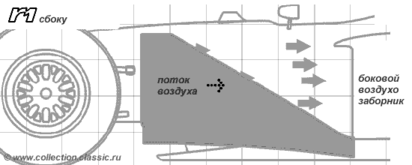 Боковые дефлекторы разделяют и направляют воздух от передних колес на две части – одна направляется на охлаждение двигателя в воздухозаборники, вторая направляется наружу.