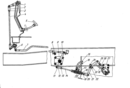 /, 22— валики; 2, 11, 20, 25— вилки; 3. 13, 24 — гайки; 4, 7, 14 — тяги; 5 — педаль; 6 — промежуточный двуплечий рычаг; 8—оттяжная пружина; 9 — задний кронштейн;