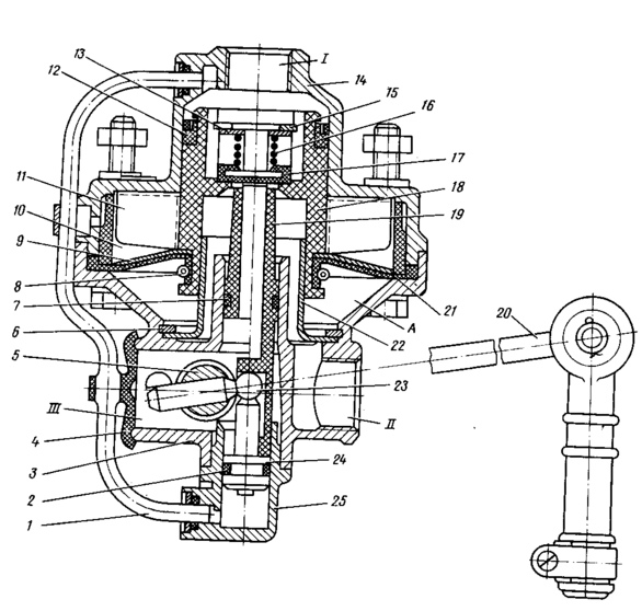 /—вывод к крану аварийного растормаживания; //—вывод к ускорительному клапану; ///—атмосферный вывод; /—трубка; 2, 7—уплотнительные кольца; 3—нижний корпус: 4. 17- клапаны: 5 -вал; 6, 15—упорные кольца; 8—пружина диафрагмы; 9—шайба диафрагмы; 10—вставка; //—ребра поршня; 12—манжета; 13—тарелка пружины клапана; 14—верхний корпус; 16— пружина; 18. 24 -поршни; 19—толкатель; 20—рычаг; 21—диафрагма; 22—направляющая; 23—шаровая пята: 25— направляющий колпачок