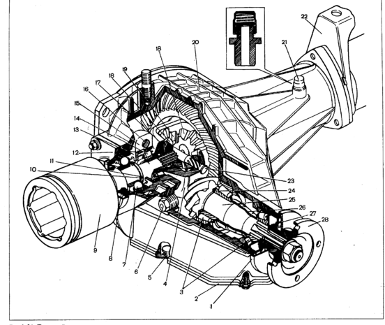 Рис. 6. Передний мост. 1- грязеотражатель; 2- нижняя крышка картера редуктора; 3- подшипники ведущей шестерни; 4- корпус дифференциала; 5- пробка сливного отверстия; 6- пробка заливного и контрольного отверстия; 7- подшипник корпуса внутреннего шарнира ; 8- сальник; 9 – корпус внутреннего шарнира привода колес; 10-пружинная шайба; 11 – стопорное кольцо; 12 – крышка подшипника; 13 – регулировочная гайка; 14 – подшипник коробки дифференциала; 15 – крышка подшипника; 16 – болт сцепления крышки; 17 – опорная шайба; 18 – шестерня полуосей; 19 – сателлит; 20 – картер редуктора; 21 – сапун; 22 – кронштейн крепления переднего моста; 23 – ось сателлитов; 24 – регулировочное кольцо ; 25 – ведущая шестерня; 26 – распорная втулка подшипников; 27 – сальник ведущей шестерни; 28 – фланец.