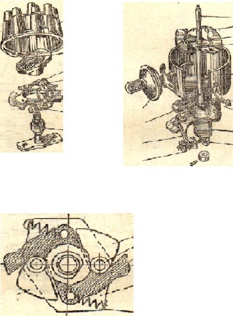 К распределителю тока высокого напряжения относится: ротор с токорозносной пластиной, крышка распределителя с клеммами для проводов и с угольным электродом для снижения радиопомех. Крышка фиксируется в определенном положение с помощью выступа на ней и паза на корпусе распределителя.