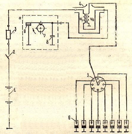 Контактная система зажигания включает в себя: аккумуляторную батарею 1, включатель зажигания 2, добавочный резистор 3, катушку зажигания 4, прерыватель тока (кулачок 7 и контакты 9), конденсатор 8, распределитель тока высокого напряжения 5, свечи 6, соединительные провода низкого и высокого напряжения.