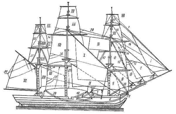 I - бом-кливер; II - кливер; III - фор-стеньги-стаксель; IV - фор-стаксель; V - фок - нижний прямоугольный парус на фок-мачте; VI - фор-марсель - второй снизу прямой парус, расположенный на фор-стеньге; VII - фор-брамсель - третий парус расположенный на фор-брам-стеньге; VIII - фор-бом-брамсель - четвертый прямой парус, расположенный на фор-бом-брам-стеньге; IX - грот-стаксель; X - грот-стеньги-стаксель; XI - грот-брам-стаксель; XII - грот - нижний прямоугольный парус на грот-мачте; XIII - грот-марсель; XIV - грот-брамсель; XV - грот-бом-брамсель; XVI - апсель - косой парус между грот- и бизань-мачтами; XVII - крюйсель - прямой парус; XVIII - крюйс-брамсель; XIX - крюйс-бом-брамсель; XX - бизань - нижний косой парус (косая бизань).
