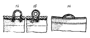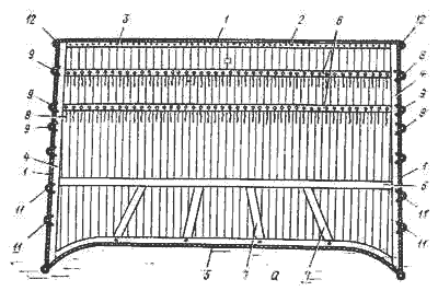а - нижний парус; б - верхний парус; 1- ликтрос; 2 - верхняя шкаторина; 3 - подшивка; 4 - боковые шкаторины; 5 - нижняя шкаторина; 6 - ванты; 7 - боуты; 8 - риф-сезни; 9 - риф-кренгельсы; 10 - кренгельсы риф-талей; 11 - кренгельсы шпрюйта буленей; 12-13 - угловые кренгельсы; 14 - кренгельсы из троса; 15 - кренгельсы с коушем.