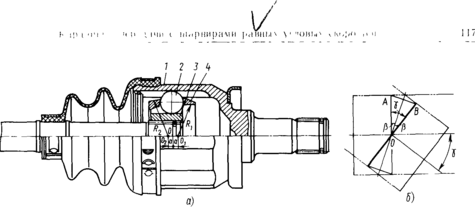 При наклоне одного из валов 5 на угол верхний шарик выталкивается из сужающего пространства канавок вправо, а нижний шарик перемещается сепаратором влево. Центры шариков всегда находятся на пересечении осей канавок. Это обеспечивает их расположение в биссекторной плоскости, что является условием синхронного вращения валов.