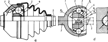 Шестишариковый карданный шарнир с делительным канавками (типа «Бирфильд»)(Рис.6). На кулаке 4, поверхность которого выполнена по сфере радиуса R1 выфрезеровано шесть канавок. Канавки кулака имеют переменную глубину. Внутренняя поверхность корпуса 1 выполнена по сфере радиуса R2 и также имеет шесть канавок переменной глубины. Сепаратор 3, в котором размещены шарики 2, имеет наружные и внутренние поверхности, выполненные по сфере радиусов соответственно R1 и R2. В положении, когда валы соосны, шарики находятся в плоскости, перпендикулярной осям валов, проходящей через центр шариков.