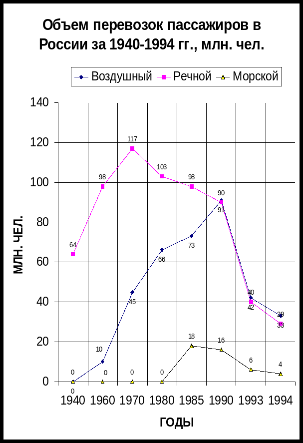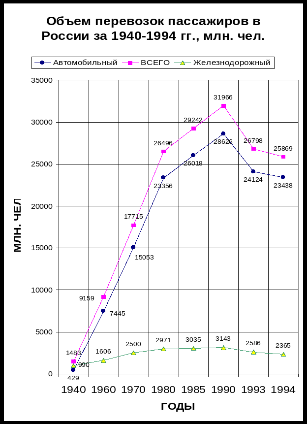 Объем перевозок пассажиров в России за 1940-1994 гг., млн. чел.