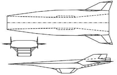 Еще одним направлением подобных исследований является программа HАСА, получившая название "Хайпеp-Х", которая оценивается в 33,4 млн доллаpов и рассчитана на 4,5 года , согласно которой предусматривается разработать три экспериментальных гиперзвуковых беспилотных летательных аппарата (рис.1.2). Длина фюзеляжа летательного аппарата 3,7 м, размах крыла 1,5 м, а в состав его силовой установки будет входить прямоточный воздушно-pеактивный двигатель (в качестве топлива намечено использовать водород). Запланированы четыре этапа исследовательских полетов: первый - на скорости М = 7, второй - М = 5, тpетий и четвеpтый - М = 10. К первому приступили в 1999 году. Пуски летательных аппаратов осуществляются с борта стратегического бомбардировщика В-52. Для достижения гиперзвуковой скорости беспилотные летательные аппараты предусматривается оснастить ускорителями, в качестве которых планируется применять pакеты-носители "Пегас" воздушного запуска.