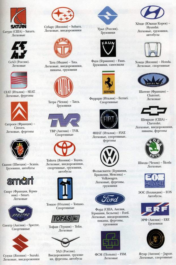 Что касается товарных знаков или эмблем, то многие из них содержат потаенный смысл, нередко связанный с историей завода или фирмы. Чаще всего имена изобретателей, конструкторов, владельцев заводов стали обозначать марки машин. Это «Форд» и «Рено», «Лянча» и «Опель», «Порше» и «Феррари». Нередко наименование образуют начальные буквы словосочетаний: Фабрика Итальянских Автомобилей в Турине (ФИАТ), Завод имени Лихачева (ЗИЛ), Байрише Моторен Верке (Баварский завод моторов, БМВ).