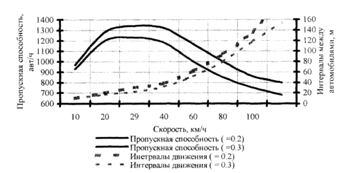 Пропускная способность и интервалы между автомобилями зависят, кроме того, от скорости движения ТС. Графически такую зависимость можно представить на рисунке 9.