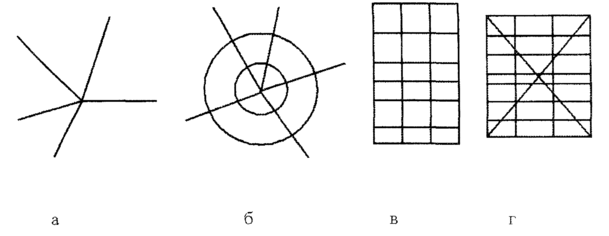 Рисунок1 - Основные геометрические схемы: построения улично-дорожной сети: а - радиальная; б - радиально-кольцевая; в - прямоугольная; г -прямоугольно-диагональная