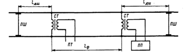 ПОБС-2АУЗ с коэффициентом трансформации 38, при этом первичная обмотка (выводы I1-I4 при перемычке I2-I3) подключается к кабелю, а вторичная (выводы II3-III3 при перемычке II4-III1) - к рельсовой линии. допускается в качестве согласующих элементов использовать дроссель-трансформаторы ДТМ-0,17-1000 или ДТ-0,6-1000М с коэффициентами трансформации соответственно 40 и 38.