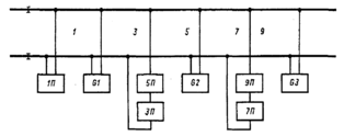 Как правило, от одного путевого генератора питаются две смежные РЦ, расположенные по обе стороны от точки его подключения к рельсовой линии. Один питающий конец, таким образом, является общим для двух приемников. Например РЦ 1 и 3 (рис.3.2) получают питание от генератора G1, а РЦ 5 и 7 - от генератора G2. Между питающими концами к рельсовой линии подключены два последовательно соединенных путевых приемника, один из которых работает на сигнальной частоте генератора G1, а другой - на сигнальной частоте генератора G2. Во избежание взаимного влияния в смежных рельсовых цепях используются разные несущие частоты сигнального тока.