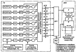 Фильтры Ф1 - Ф6, РФ выделяют основную гармонику усиленного сигнала, который поступает на их входы с трансформатора ВТ, и обеспечивают с контрольными реле 1К - 6К, РК контроль вырабатываемой соответствующими генераторами частоты и значения сигнала. В основных комплектах фильтр настроен постоянно на частоту генератора, к которому он подключен. Фильтр РФ резервного комплекта перестраивается одновременно с генератором PG посредством схемы настройки, выполненной на контактах контрольных реле 1К - 6К. Если какое-нибудь из контрольных реле отпускает якорь, его контакты перестраивают резервный генератор и фильтр на соответствующую частоту и подключают к требуемой сигнальной шине, отключив от нее неисправный комплект. При одновременной неисправности двух комплектов замещается комплект, обеспечивающий передачу сигнала о более высокой допустимой скорости движения, поэтому отказ не окажет существенного влияния на пропускную способность линии.