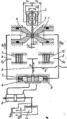 . После отклонения сопротивление сопла, к которому приблизилась заслонка, увеличивается и расход через него уменьшается. Расход в другой ветви возрастает. При этом возникает неравенство давлений