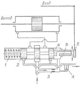 1 - пружина; 2 - плунжер; 3 - дроссель; 4 - клапан; 5 - заслонка