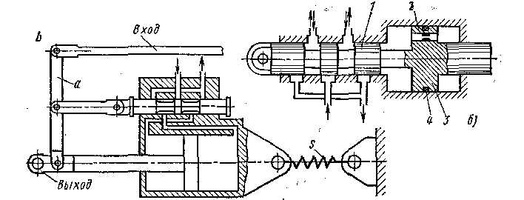 Для повышения чувствительности усилителя и обеспечения одновременно увеличения мощности выходного сигнала применяют двухкаскадные устройства, первой ступенью усиления которых является обычно усилитель типа сопло- заслонка, а второй - золотник. Принципиальная схема такого устройства показана на рис.9. Междроссельная камера a этой схемы соединена с правой полостью основного распределительного золотника, плунжер 2 которого находится в равновесии под действием усилия пружины 4 и давления жидкости в этой камере. Жидкость постоянно подводится в штоковую полость b силового цилиндра, поршень которого при одновременной подаче жидкости в противоположную полость перемещается вследствие разности площадей поршня влево, и при соединении этой полости с баком - в правую сторону.