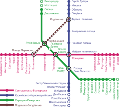 Лінії метрополітену перетинають всі 10 районів міста. Перша лінія, Святошинсько-Броварська, історія якої починається з 6 листопада 1960 року, має довжину 22,8 км (із яких 6,7 км – наземна ділянка) і 18 станцій. Наземна ділянка має 2 мостових переходи – через ручку Дніпро та Русанівську протоку та 2 шляхопроводи. Друга лінія, Куренівсько-Червоноармійська, перша ділянка якої була введена в експлуатацію 16 грудня 1976 року, має довжину 13,2 км і 12 станцій. Третя лінія, Сирецько-Печерська, перша ділянка якої була введена в експлуатацію 31 грудня 1989 року, має довжину 22,5 км і 14 станцій.