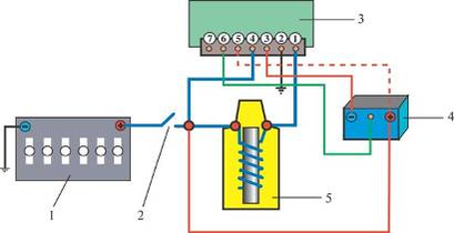 1 - аккумуляторная батарея; 2 - контакты замка зажигания; 3 - транзисторный коммутатор; 4 - датчик распределитель (датчик Холла); 5 - катушка зажигания