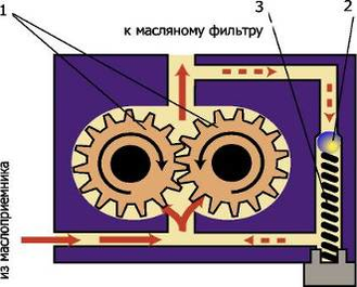 Масляный насос (рис. 27) под давлением подает масло (через фильтр и каналы) к трущимся деталям кривошипно-шатунного и газораспределительного механизмов. Насос состоит из двух шестерен и приводится в действие от коленчатого вала двигателя. При вращении шестеренок, зубья захватывают масло и нагнетают его в главную масляную магистраль.