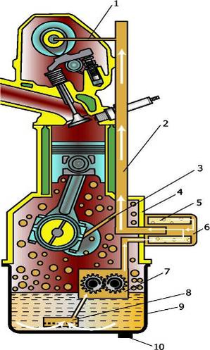 1 - канал подачи масла к газораспределительному механизму; 2 - главная масляная магистраль; 3 - канал подачи масла к подшипникам коленчатого вала; 4 - картер двигателя; 5 - фильтрующий элемент; 6 - корпус масляного фильтра; 7 - масляный насос; 8 - маслоприемник с сетчатым фильтром; 9 - поддон картера; 10 - пробка для слива масла