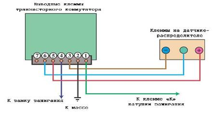 б) схема электрических соединений коммутатора и датчика-распределителя