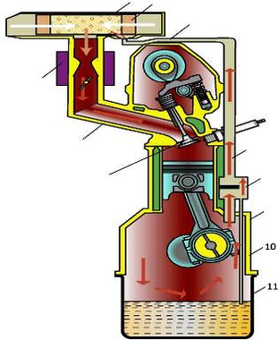 1 - корпус воздушного фильтра; 2 - фильтрующий элемент; 3 -всасывающий коллектор вентиляции картера; 4 - карбюратор; 5 - впускной трубопровод; 6 - впускной клапан; 7 - шланг вентиляции картера; 8 - маслоотделитель; 9 - сливная трубка маслоотделителя; 10 - картер двигателя; 11 - поддон картера