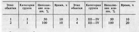 Екскаватор ЭО-6122. Обкатування машин виробляється з різними навантаженнями під спостереженням механіка протягом 50 ч (див. табл. 9). Перевіряють обертання гідронасосів короткочасним їхнім включенням. Потім запускають електродвигун і працюють у неодруженому режимі гідронасосів 1 ч, прослухуючи їхню роботу. Якщо температура робочої рідини в гідробаці підвищиться понад 50°С, то включають вентилятор маслоохладителя. При виявленні підвищеного (нехарактерного) шуму або стукоту, течі робочої рідини виключають електродвигуни, виявляють несправності й усувають них. Після того як переконаються в нормальній роботі гідронасосів на неодруженому ходу, приступають до обкатування механізмів екскаватора. Обкатування в неодруженому режимі і під навантаженням проводять по тим же правилам і в тих же обсягах, як і екскаваторів ЭО-5123.