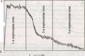 При этом характер колебаний / в процессе обработки позволяет выделить переходные зоны, связанные с выходом оборудования на установившийся режим. Протяженность переходных зон зависит от режущей способности круга. Чем острее зерна абразива, тем быстрее выбирается натяг технологической системы и тем короче переходные зоны на акустограмме I/t).