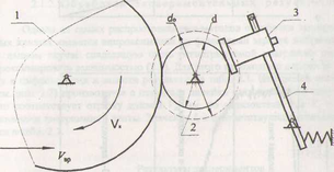 В условиях круглого врезного шлифования (при вращении детали) регистрация сигнала (рис. 2.1) производится путем поджима датчика 3 к поверхности детали 2. Для уменьшения трения между датчиком и деталью используется тифлоновая пробка. Благодаря кулисному механизму поджима 4 уменьшение диаметра детали