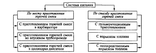 В зависимости от места и способа приготовления горючей смеси двигатели автомобилей могут иметь различные системы питания (рис. 1).