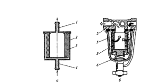 Разборный фильтр (рис. 5, б) состоит из корпуса 2, отстойника 5 и фильтрующего элемента 3. Фильтрующий элемент изготовлен из латунной сетки, намотанной в два слоя на стакан из алюминиевого сплава, который имеет на боковой поверхности ребра и отверстия для прохода топлива. Сетка на стакане удерживается пружиной, надетой снаружи на фильтрующий элемент. Фильтрующий элемент 3 находится внутри отстойника 5 и поджимается пружиной 6 к корпусу фильтра через уплотнительную прокладку.