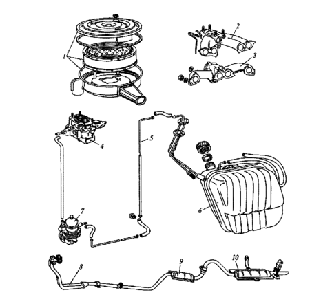 1 — воздушный фильтр; 2,3 — трубопроводы; 4 — карбюратор; 5 — топливопровод; 6 — бак; 7 — насос; 8 — труба; 9, 10 — глушители