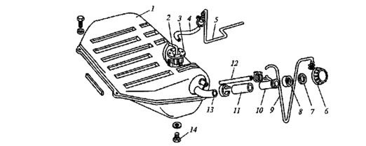 1 — половина бака; 2, 9, 12 — трубки; 3 — датчик; 4, 11 — шланги; 5 — топливопровод; 6, 14 — пробки; 7 — прокладка; 8 — уплотнитель; 10, 13 — трубы
