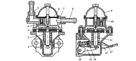 В топливном насосе (рис. 4) между верхней 7 (с крышкой 9) и нижней 1 частями корпуса установлен блок диафрагм 3, который соединен со штоком 11. Шток охватывается вильчатым концом балансира 15 рычага 16 привода насоса. На штоке установлена пружина 2 блока диафрагм. В верхней части корпуса насоса находятся всасывающий 10 и нагнетательный 4 клапаны. Привод насоса осуществляется толкателем от эксцентрика вала привода масляного насоса. Под воздействием эксцентрика толкатель нажимает на верхнюю часть рычага 16, а балансир 15 через шток 11 перемещает блок диафрагм 3 вниз. При этом пружина 2 сжимается. Объем полости над блоком диафрагм увеличивается, и топливо под действием разрежения из бака поступает в насос через всасывающий патрубок 8, сетчатый фильтр б и всасывающий клапан 10. Нагнетательный клапан насоса при этом закрыт. Вверх блок диафрагм перемещается под действием пружины 2, когда балансир 15 не удерживает шток 11.