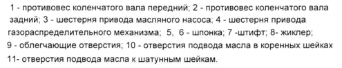 Для уравновешивания сил инерции и уменьшения вибраций коленчатый вал имеет шесть противовесов, отштампованных заодно со щеками коленчатого вала. Кроме основных противовесов, имеются два дополнительных съемных противовеса 1 и 2. напрессованных на вал, при этом их угловое расположение относительно коленчатого вала определяется шпонками 5 и 6 (рис.1).