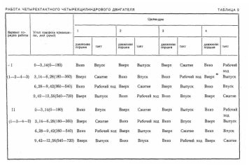 Перечисленные такты составляют непрерывно повторяющийся четырехтактный цикл двигателя; работа совершается только на протяжении третьего хода, поэтому он и называется рабочим; три остальные хода являются вспомогательными и на их совершение тратится часть работы, полученной при третьем ходе поршня (табл. 2). График работы, изображенный на рис. 6, а, является теоретическим. Наличие ряда дополнительных условий в работе двигателя, а также стремление обеспечить лучшее наполнение цилиндра рабочей смесью, достичь более полного сгорания горючей смеси и очищения цилиндра от газов заставляют несколько сдвигать границы этих процессов.