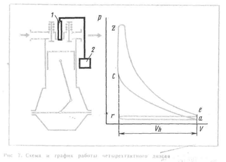 На рис. 7 показаны схема и график работы четырехтактного дизеля (типа ЯМЗ). При перемещении поршня от верхней мертвой точки к нижней через открытый впускной клапан засасывается воздух (левая стрелка), при перемешивании которого с остаточными газами совершается такт впуска (линия га на графике работы); в следующий ход поршня происходит сжатие смеси с остаточными газами при закрытых клапанах (линия ас); степень сжатия достигает 14 - 20, а давление конца сжатия равно 3 - 4 Мн1м2 (30 — 40 кГ/см2} при температуре 600 - 700° С. В конце сжатия через форсунку 1 насосом 2 под давлением впрыскивается топливо, мелкие частицы которого, соприкасаясь с раскаленным воздухом, сгорают (линия cz); давление поднимается до 5 — б Мн1мг (50 — 60 кГ/см2, а температура — до 1800 - 2000° С. Под влиянием большого давления газов происходит рабочий ход (линия ze) последним ходом (линия еr) поршень выталкивает отработавшие газы через открытый выпускной клапан (правая стрелка) — такт выпуска.