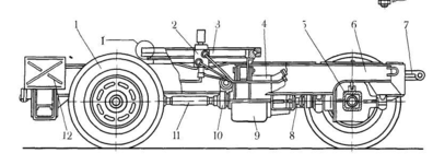 Вихідний вал коробки передач одним кінцем через муфту вмикання переднього моста і зубчасту муфту з’єднаний з переднім мостом 5, другим кінцем через зубчасті муфти і проміжний вал — з заднім мостом 1. Праворуч на картері переднього моста розташований гідроциліндр керування поворотом передніх коліс, зв’язаний тягами і важелями зі ступицею правого колеса. Праве колесо зв’язано з лівим поперечною рульовою тягою. В передній частині візка встановлено водило 7, використовуване при буксировці екскаватора тягачем.
