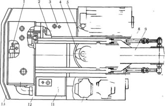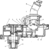 1, 3, 5 – шестерні, 2 – поворотний вал, 4, 6 – вали-шестерні, 7 – муфта, 8 – гідромотор, 9 – вал гідромотора, 10 – масломірна лінійка, 11 – корпус, 12 – маслянка, 13 – шайба