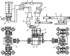1, 5 - задній і передній мости, 2 - центральний колектор, 3 - трубопроводи, 4 - гідромотор, 6 - рама, 7 - водило, 8 - механізм вмикання переднього моста, 9 - коробка передач, 10 - зубчаста муфта, 11 - проміжний вал, 12 – виносна опора, 13 – роликове опорно-поворотне коло