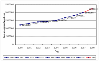 За семь лет прирост числа автомобилей составил 771.514 шт., т.е. в среднем парк автомобилей увеличивается на 9% в год. При этом следует отметить, что рост числа автомобилей идет нарастающими темпами, т.е. если за 2005 г. парк автомобилей вырос на 4,7%, то за 2008 г. этот рост составил 10%. На основе этого можно предположить, что за 2009 г. рост парка автомобилей составит около 12%.